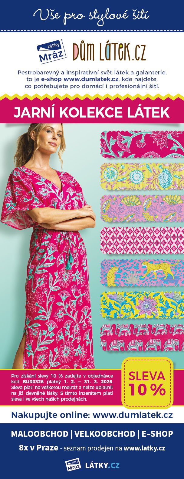 Slevu 10 % získáte po předložení tohoto inzerátu, který najdete v časopise Burda číslo 3/2026, nebo ho můžete předložit v elektronické podobě při placení. Sleva 10 % platí od 1. 2. do 31. 3. 2026.