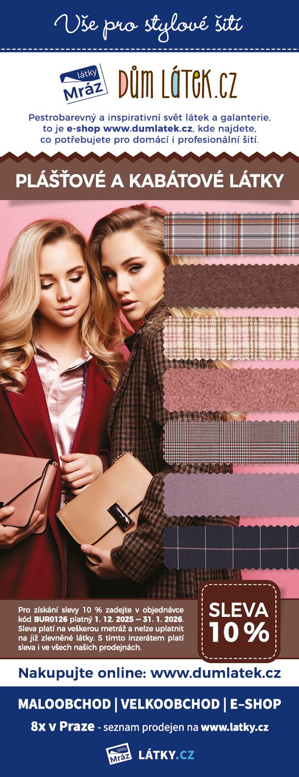 Slevu 10 % získáte po předložení tohoto inzerátu. Ten najdete v časopise Burda číslo 1/2026, nebo ho můžete předložit v elektronické podobě při placení. Sleva 10 % platí od 1. 12. 2025 do 31. 1. 2026.