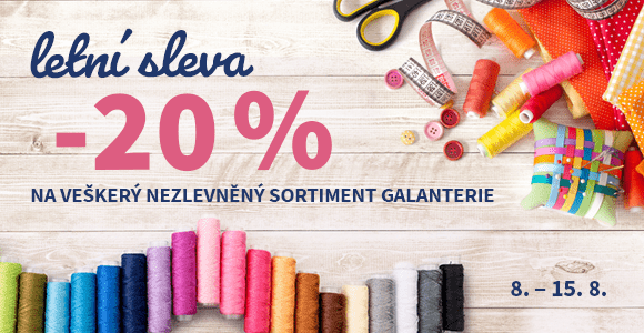 Galanterie? Té není nikdy dost – a právě teď máme SLEVU 20 %! Nitě, zipy, jehlice, háčky, metry, stužky, vyšívací bavlnky, knoflíky, suché zipy, karabiny, patentky, gumičky, špendlíky, jehly… zkrátka celý sortiment galanterie, který najdete na našem e-shopu dumlatek.cz i v kamenných prodejnách, je nyní se SLEVOU 20 % na nezlevněné položky.